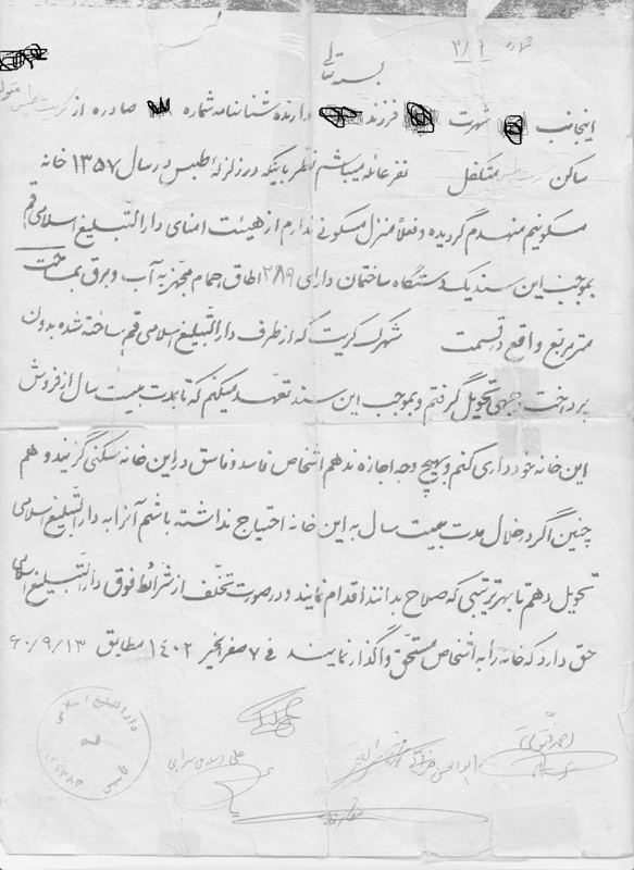 بعد از زلزله طبس دارالتبلغات اسلامی قم شروع به ایجاد تعدادی مسکن برای روستای زلزله زده کریت نمود و به اهالی واگذار کرد این سند واگذاری یکی از خانه هاست.